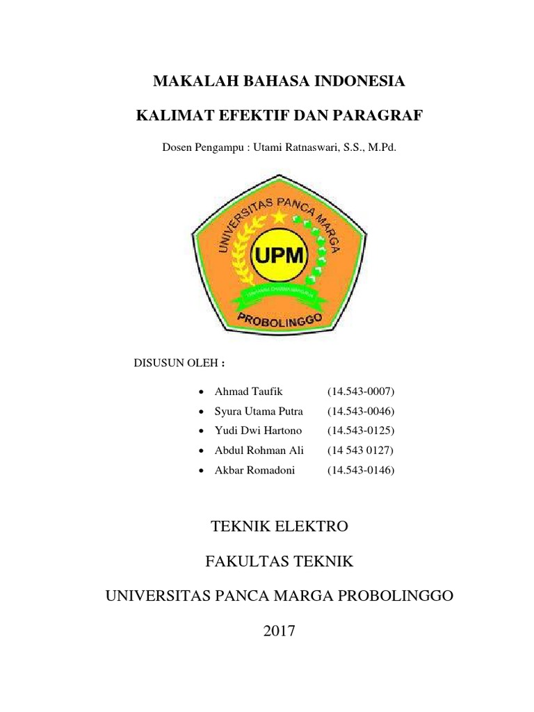 Alhamdulillah dengan memanjatkan puji syukur kehadirat allah swt yang maha pengasih dan penyayang yang telah memberikan rahmat, hidayah dan inayahnya kepada kami, sehingga dapat menyelesaikan penyusunan makalah ini tentang kalimat efektif. Karya ilmiah implementasi kurikulum 2013. Berikut sampel makalah bahasa indonesia tentang kalimat terbaru lengkap dengan cover, daftar isi, kata pengantar, bab i pendahuluan, ii pembahasan, iii. Sebelumnya kami sudah memberikan contoh makalah bahasa indonesia dengan judul makalah cerpen. Kalimat topik merupakan kalimat terpenting yang berisi ide pokok alinea.